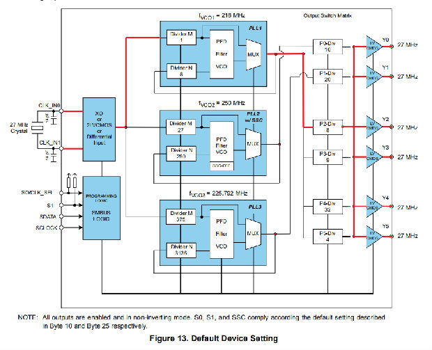 SSC也是可旁路的(字节25,位[6:4]),它关闭SSC输出并将其设置为逻辑低状态。PLL2的非SSC输出不受此模式影响,仍可使用。