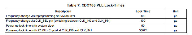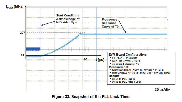 PLL锁定时间取决于器件配置,并且可以通过VCO频率来改变,即通过改变M/N分频器的值。表7给出了CDC706的典型锁定时间,图33显示了频率开关的快照。