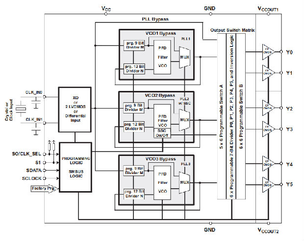 为了实现独立的输出频率,每个PLL的参考分频器M和反馈分频器N可以设置为M分频器的1到511以及N分频器的1到4095的值。PLL-VCO(压控振荡器)频率比被路由到自由可编程输出开关矩阵的六个输出中的任何一个。开关矩阵包括额外的7位后除法器(1到127)和每个输出的逆变逻辑。