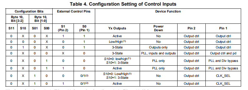 两个自由可编程输入,S0和S1,可用于控制每个应用最苛刻的逻辑控制设置(输出禁用到低,输出3态,断电,PLL旁路等)。