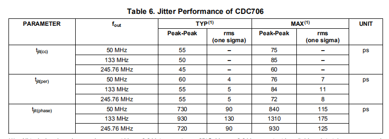 抖动是基于锁相环的时钟驱动电路的一个主要参数。随着速度的提高和时间预算的减少,这一点变得非常重要。CDC706的锁相环和内部电路设计为最小抖动。峰间周期抖动仅为60ps(典型)。表6给出了表征过程中周期到周期抖动、周期抖动和相位抖动的峰峰值和均方根偏差。