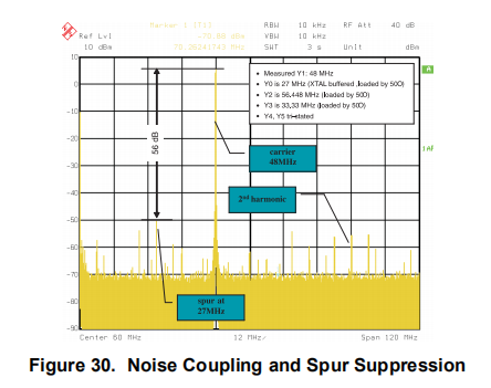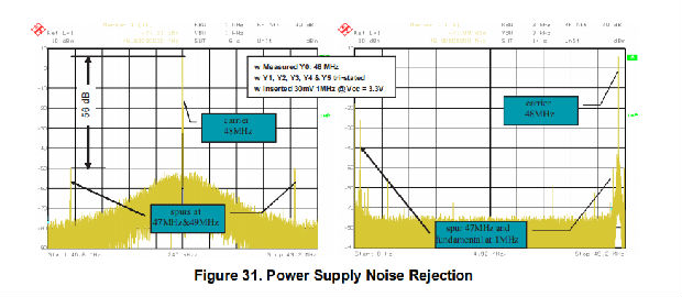 良好的隔离度是使用BiCMOS工艺的一个主要标准,因为它可以使耦合效应最小化。即使所有三个锁相环都激活并且所有输出都打开,噪声抑制明显高于50分贝。图30和图31显示了CDC706的噪声耦合、杂散抑制和电源噪声抑制的示例。模具各自的测量条件如图30和图31所示。