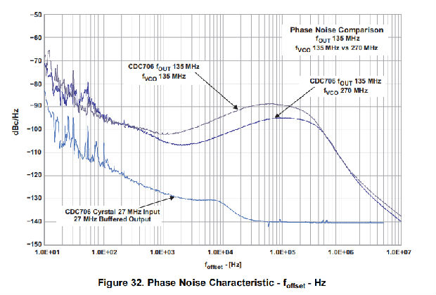 对于CDC706,两个相位噪声特性是令人感兴趣的:晶体输入级的相位噪声和内部锁相环(VCO)的相位噪声。图32显示了各自的相位噪声特性。