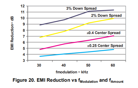 最佳阻尼是调制量、调制频率和所考虑的谐波的组合。请注意,由于频率偏差较大,高次谐波频率会导致更强的EMI降低。