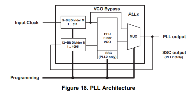 为了获得最佳的抖动性能,请使分频器M尽可能小。此外,分数除法器概念要求PLL除法器配置,M≤N(或N/M≥1)。