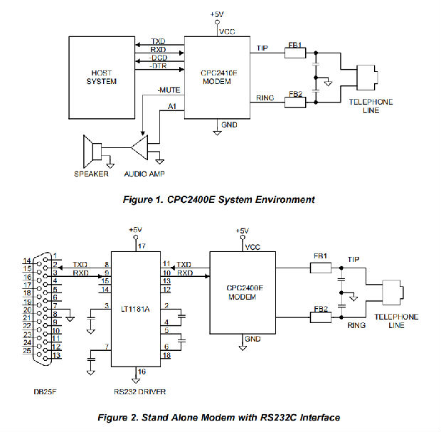 图2是独立RS232C配置中CPC2400E的示意图。该电路采用线性技术LT1181A RS232线路驱动器。注意,LT1181A线路驱动器反转信号。图1和图2仅供参考。准确的组件值应由用户确定。