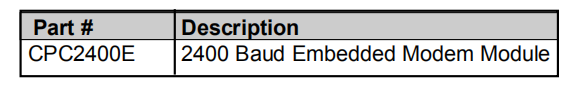 CPC2400E是一个2400波特的嵌入式调制解调器模块,用于需要连接到公共交换电话网(PSTN)的数据通信链路的应用。CPC2400E是一个完整的模块,位于1.0“x 2.5”小型印刷电路板上,可插入或焊接到主机系统母板中。该模块是FCC第68部分批准的,并包括一个用户可转让的注册号。它也是UL认可的组件。CPC2400E可用于多种应用,包括机顶盒背面通道通信、自动售货机、远程公用事业计量、远程数据采集,以及许多其他应用。CPC2400E支持DTE设备的标准串行V.24 TTL接口。