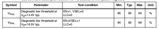 “1”。输出电压诊断仅在LLC=0和AUX=0时有效。任何VMONLLC=1和/或AUX=1的信息必须被MCU忽略。