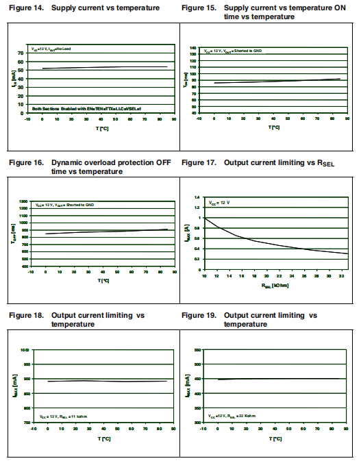 为了减少过载或短路情况下的总功耗,装置具有动态短路保护。可以静态(简单电流钳)或通过I2C SR的PCL位。当PCL(脉冲电流限制)位设置为低时,过流保护电路动态工作:一旦检测到过载,输出关闭一段时间,通常为900毫秒。同时,诊断OLF I2C位系统寄存器设置为“1”。经过这段时间后,输出将恢复一段时间TON=(1/10)TOFF=90毫秒(典型值)。在吨结束时,如果仍然检测到过载,则保护电路将再次循环通过TOFF和TON。在一整吨的最后检测到过载,恢复正常操作,OLF诊断位重置为低。典型的TON+TOFF时间为990毫秒,由内部计时器确定。这种动态运行时可大大降低短路情况下的功耗,仍能保证在大多数情况下都能启动。但是,在其中高容性负载对输出可能造成启动困难时,动态选择了保护。这可以通过在静态模式下启动任何电源来解决(PCL=1),然后在选定的时间后切换到动态模式(PCL=0)取决于输出电容。在静态模式下,诊断OLF位转到达到电流钳位限值时为“1”,过载条件下返回低电平变明朗。