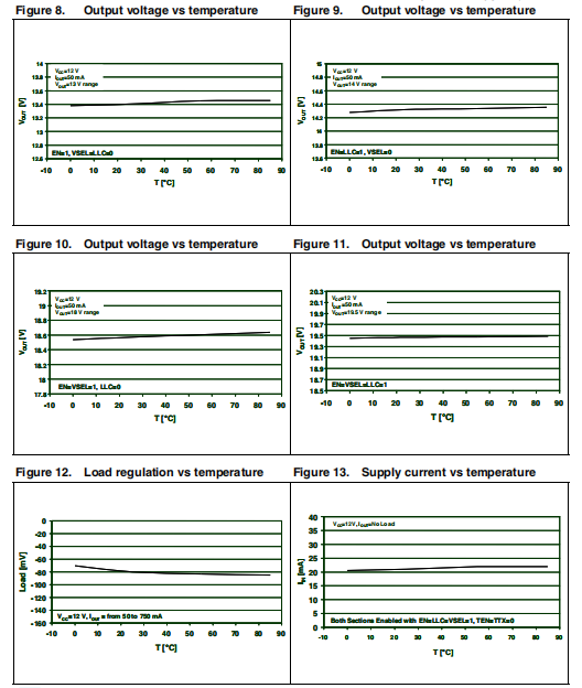 该集成电路有一个内置的DC-DC升压变换器,从单个8 V电源到15 V电源,产生使线性后调节器工作在最小值的电压(VUP)0.375 W典型耗散功率。@500 mA负载(线性后调节器压降为内部保持在VUP-VOUT=0.75 V典型值)。欠压锁定电路将使当提供的VCC降至固定阈值(通常为6.7 V)以下时,整个电路。注:在本文件中,VOUT用作线性后调节器上的电压输出(VoRX引脚)。