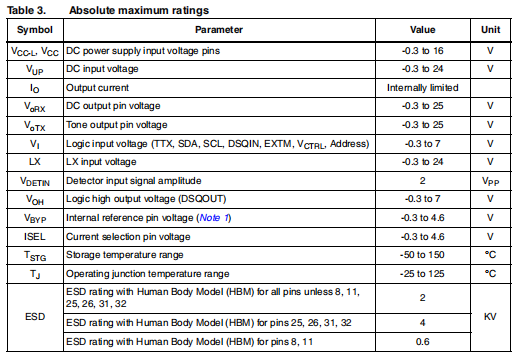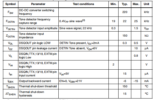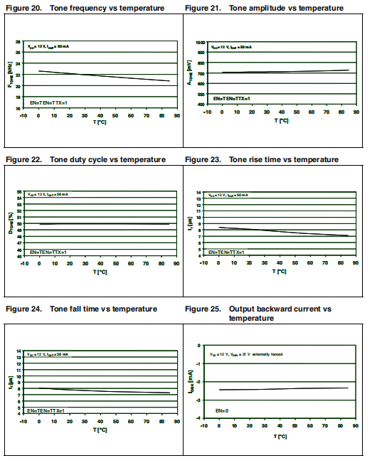 新的内部22千赫音频发生器(正在申请专利)是工厂根据根据标准,可通过I2C接口选择TTX位(或TTX引脚)和由专用引脚(DSQIN)激活,可立即进行DiSEqC™ 数据编码,或如果在连续模式下请求22 kHz存在,则通过10个I2C位。在待机状态(EN位低)。必须禁用TTX功能,将TTX设置为低。