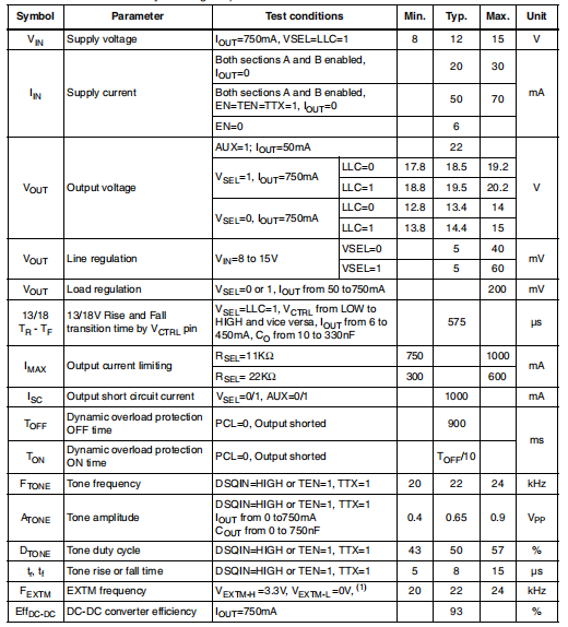 LNBH24包括两个完全独立的部分。除了VCC和I2C输入端,每个电路可单独控制,并有独立的外部组件。对于这两个部分,应同等考虑以下规范(A/B)。