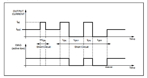 当Toff时间间隔到期时,输出功率MOS接通。现在可能会出现两种情况-过载仍然存在。在这种情况下,输出功率MOS再次以线性模式驱动(限制Isc的输出电流)再增加一吨,开始新的循环,或-过载条件消除,输出功率MOS不再线性驱动模式。所有这些情况都出现在诊断图上销(见图2)。我们称这种独特的功能为耗散短路保护,即使在永久性的情况下也能保证非常安全的运行过载情况。请注意,当然,请为吨间隔选择最合适的值(即Cdon电容器的值)延迟将防止在DIAG输出上出现误导性的短路信息,当驱动电容性负载时(表现为短路最开始的电路)或白炽灯灯(冷灯丝的电阻很低值)。