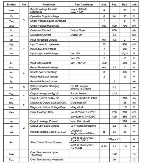 兼容宽电压范围的TTL/CMOS高抗扰度(得益于内置的hys teresis)可供选择。过热保护(OVT)一种片上过温保护在极端情况下对设备提供了极好的保护条件。当芯片中央部分测得的温度超过Tmax=150 C(典型值)设备关闭,诊断输出变低。当芯片温度(通常在几秒钟后)降至以下时,恢复正常操作Tmax Thys=130摄氏度(典型值)。迟滞避免间歇性行为发生。