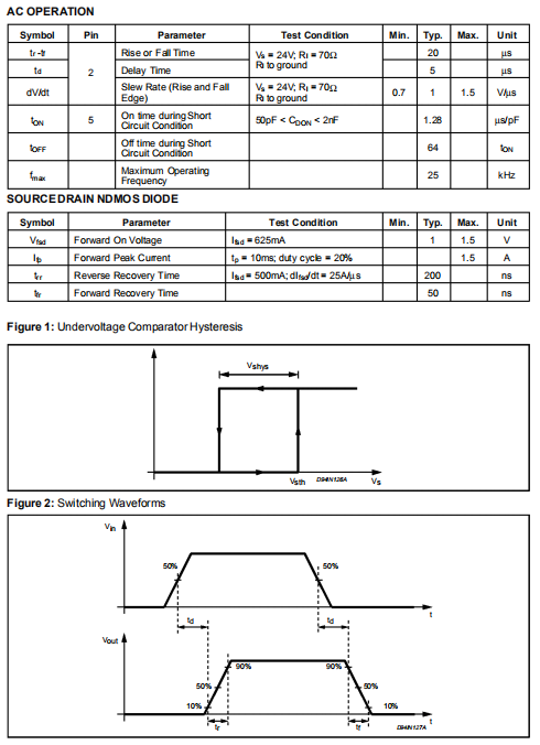 电源电压预计在8到35 V。在这个范围内,设备工作正常。低于8 V时,必须认为整个系统不可靠。为了避免任何故障持续监控电源电压,以提供欠压保护。当Vs下降时,Vsth Vshys较低(通常为7.5 V,见图1)输出功率MOS关闭,DIAG out输出变低。正常操作恢复为一旦Vs超过Vsth。迟滞特性可防止低电源下的间歇性运行电压。