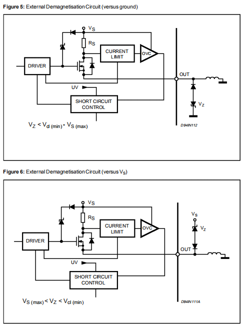 禁用(保持Ton=0,但有输出只需将电流限制在地上。感应负载的消磁L6377有一个内部箝位齐纳二极管能够消磁感应负载。请注意限制来自于包可以处理。必须注意正确的电路板热设计。如果,出于什么原因(负载电流或感应值也是大)峰值功率损耗太高,外部齐纳二极管配置,会形成对地或对地消磁Vs(见图5和图6)。击穿电压选择外部齐纳二极管时,必须考虑内部箝位电压(Vcl)和电源电压(Vs)根据:Vz<Vcl(最小值)-Vs(最大值)对地消磁或Vs(最大)<Vz<Vcl(最小)退磁Vs