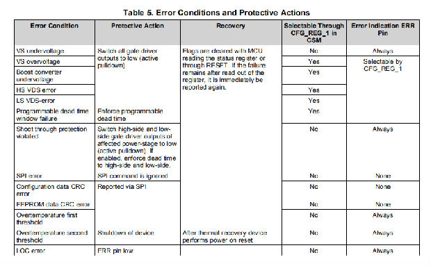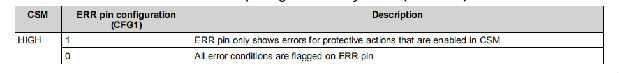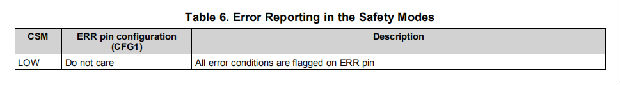 表5定义了在某些错误情况下采取的保护措施。当设备处于完全安全模式时,所有内部保护功能都会被激活,如果检测到相应的错误情况,则会采取下面列出的所有保护措施。当设备处于可配置安全模式(CSM)时,CSM可用的错误条件、保护动作和ERR引脚指示(见ERR引脚上的错误指示)可配置为CFG1中的相应位。无论CSM设置如何,如果存在相应的错误情况,则始终设置诊断标志。