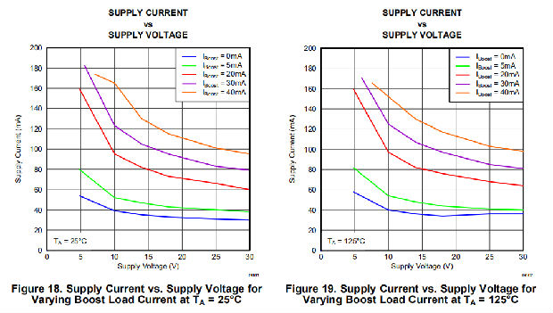 为了估算VS电池供电的总电流消耗,可以使用图14和图15中的曲线IBOOST=30 mA。从该曲线可以看出,对于VS=14 V,在TA=25°C时,VS的总电流消耗为105 mA;在TA=125°C时,VS的总功耗分别为1.47 W;在TA=125°C时,VS=14 V时,总功耗为1.50 W。