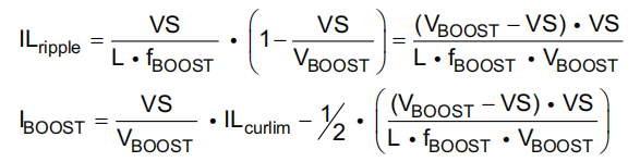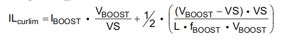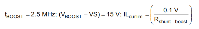 从方程式6可以看出,给定IL_curlim的升压输出电流能力是最小电源电压VS.升压输出电流能力的最低值(通过设置带外部Rshunt_boost的IL_curlim),以便所需的输出电流(基于外部功率FET的PWM频率和栅极电荷)可以在需要的时候提供应用的最小电源电压。下式给出了IL_curlim作为IBOOST和VS的函数: