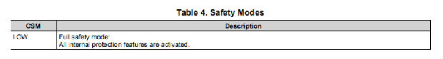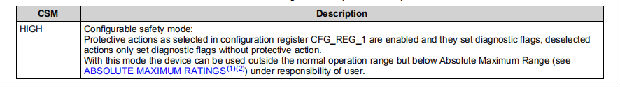 DRV3201-Q1可在两种不同的安全模式下工作,由外部引脚CSM控制,如表4所述。该引脚可通过SPI寄存器RB0读回。