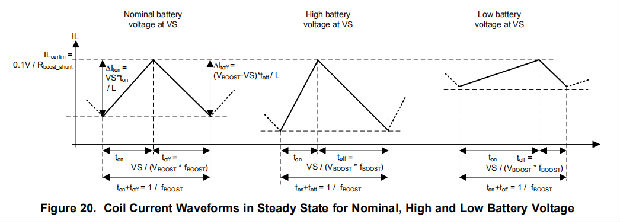 一旦升压达到稳定状态,突发脉冲期间的标称开关频率为2.5mhz。在启动升压过程中,内部时间基准比方程式4慢三倍,从而使关闭时间延长三倍,从而使线圈电流充分降低,与方程式4相比。