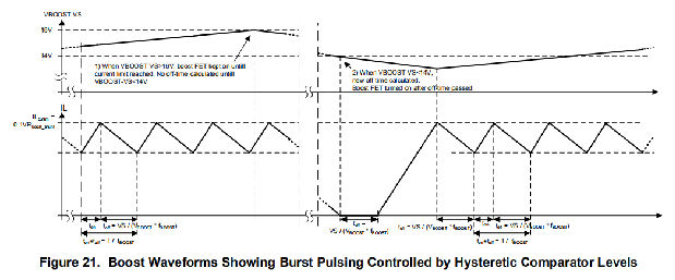 如等式6所示,当电源电压较高时,升压输出电流能力增加,而如果升压输出电流能力的尺寸被确定为可以为最小电源电压提供所需的输出电流,则实际输出的电流大于标称电源电压所需的电流,且升压电压增加。因此,滞后比较器(低电平VBOOST-VS=14V,高电平VBOOST-VS=16V)确定启动/停止突发脉冲,如图21所示。