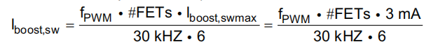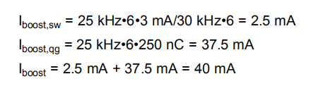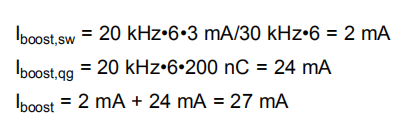 对于30 kHz PWM频率和所有六个栅极驱动器,来自内部栅极驱动器(无外部功率FET)的开关电流以高电气特性VGS,HS给出。总负载电流Iboost由方程式1和方程式2之和得出:河流切换。开关栅极驱动器(无外部功率场效应晶体管)引起的升压变换器的预期电流消耗可计算如下:
