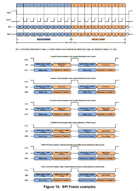 可以在一个SPI通信序列(NCS=0)期间混合两种访问模式(写和读访问)。通过断言NCS=1,可以在单个8位SPI传输之后终止SPI通信。设备返回STAT1寄存器(对于通电后的第一次SPI传输)或在SPI传输地址阶段寻址的当前寄存器值。
