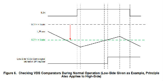 为了验证VDS比较器在正常运行期间的正确操作,可以通过SPI降低比例因数,也可以从外部降低SCTH电压。这将设置较低的VDS阈值(主要取决于随机比较器偏移<±100 mV),这将导致比较器在通过外部功率FET的相对低电流下切换(在正常操作期间没有过电流)。如图6所示。在该验证过程中,可按照可配置安全模式(配置寄存器1(CFG1),位3:4)中所述禁用VDS错误的错误处理,以便VDS错误仅在SPI状态寄存器0(STAT0)和ERR引脚上被标记。SCTH引脚是一个高阻抗输入到MOS栅极,具有内部ESD接地保护。任何电源都没有反向上拉路径(故障安全ESD结构)。