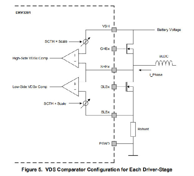 每个门驱动器的VDS比较器配置如图5所示。如图5所示,VSH引脚用作高压侧VDS比较器的检测输入电压。在外部,该VSH引脚应连接至功率级正电源的星形点。