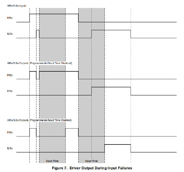 数字逻辑防止一个功率级的高、低压门驱动器同时激活。如果检测到来自MCU的同时激活命令,则在状态寄存器中标记故障。