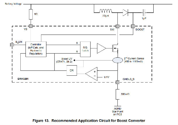 第二个内部电流限制被实现,在更高的电流下触发,并在电阻器R1短路的情况下作为内部低侧boost FET的第二级保护。如果Rboost_分流器短路,控制器将使用第二个电流限制来关闭内部低压侧升压场效应晶体管。由于第二内部电流限值高于由RBOST分流器设置的正常电流限值,且仅用于保护内部升压场效应晶体管,因此,如果第二内部电流限值激活,外部线圈可能饱和。为了允许外部MCU检测到这种可能的故障情况,第二个内部电流限制设置升压欠压标志(寄存器STAT1,位2)。根据配置的安全模式,这将导致闸门驱动器关闭。