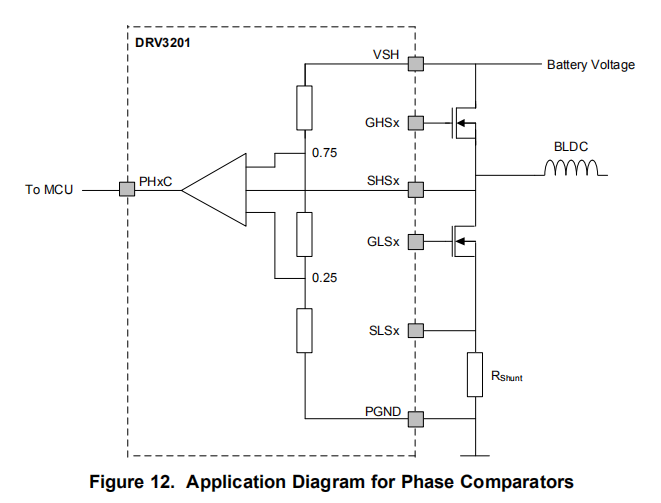 该装置包含三个实时相位比较器,可用于无传感器换向和诊断。每个比较器通常在75%和25%的电源电压下切换,并且有一个单独的数字输出到MCU。只要EN为高,相位比较器总是激活的。