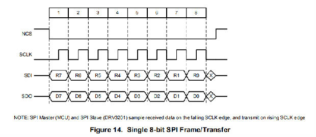 在NCS下降沿之后,7位的第一个字是地址位,后面是RW位。在第一次地址传输期间,设备在SDO上返回STAT1寄存器。处理每个完整的8位帧。如果在传输8位的倍数之前NCS变高,则忽略这些位。