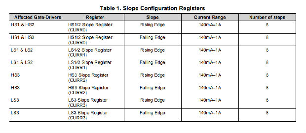 DRV3201-Q1的设计支持自适应斜率控制,通过可编程的汇电流和源电流对外部功率FET的栅极进行充放电。表1给出了用于编程栅极驱动器的漏电流和源电流的斜坡寄存器。