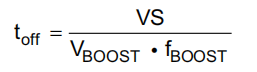 boost变换器的输出电流能力可配置为外部Rshunt_boost电阻至0.1v/Rshunt_boost(请注意,该电阻器需要能够传导升压开关电流)。输出电流容量可以根据外部功率场效应管的PWM开关频率和栅极电荷来确定。建议选择电流饱和水平至少高于电阻器Rboost_分流器设置的电流极限水平30%的线圈。boost变换器的工作原理是基于突发模式的固定频率控制器。在接通时间内,内部低压侧升压场效应晶体管接通,直到检测到电流极限电平。通过感应电源电压VS和输出电压VBOOST,根据2.5 MHz时间基准按比例计算关闭时间。公式4给出了计算关闭时间的公式,fboost=2.5 MHz。