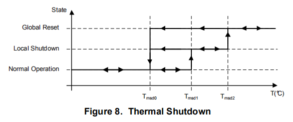 装置的热过载检测和保护基于五个温度传感器和两个阈值Tmsd1(热警告)和Tmsd2(热全局复位):