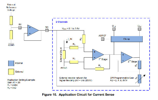 第一级运算放大器与外部电阻网络一起工作,以便更灵活地根据应用要求调整电流测量值。