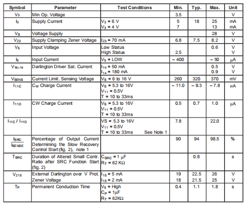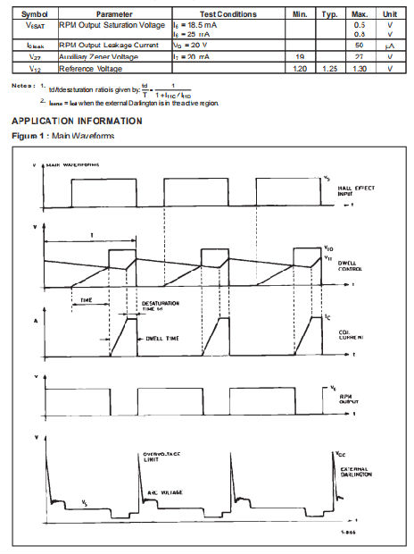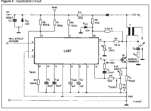 由于针脚11的电压范围上限,如果使用图4中的组件,低于10 Hz(4缸发动机为300 RPM)关闭时间达到最大值(约50毫秒),然后电路逐步地控制停留角因为=T–50毫秒。超过200赫兹(对于4缸发动机为6000转/分)传导时间小于3.5毫秒。如果使用的coilis 6mh,6A,则关闭时间缩短归零,电路失去保持角控制。