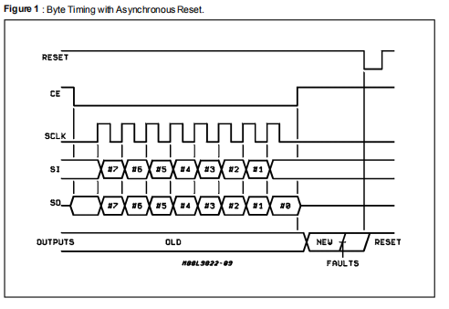 当芯片启用(CE)引脚为拉低。Thetri-stateSerialOutput(SO)引脚驱动程序将使CE较低的时间成为可能。在CE引脚的边缘,诊断数据来自输出级中的电压比较器将接入移位寄存器。如果特定输出是高,一个逻辑信号会被塞进移位寄存器。如果输出低,逻辑零将在这里装的最重要的位(07)应该是显示串行输入(SI)引脚。一个零引脚将编程一个输出,而一个将编程输出关闭。