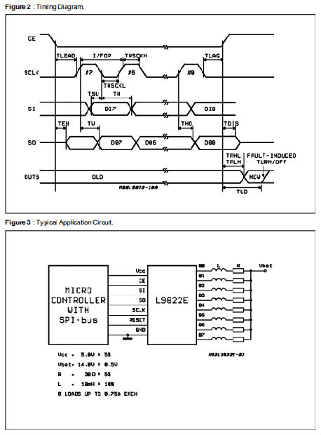 L9822ESPDMOS输出一个低操作po werdevicefeatu环,八个1ΩRDSON dmos驱动器输出级有瞬态保护电路。每个信道由输出锁存器和公共复位线独立控制所有八个输出。驱动器的饱和度低短路保护和直流电以及电磁阀、灯和继电器等电阻负载。数据通过这些串行接口(SPI)传输到设备协议。那个电路通过串行输入接收8位串行数据(SI)存储在内部寄存器中以控制输出驱动程序。串行输出(SO)提供8表示电压水平的诊断数据位在驱动器输出端。这使得微处理器诊断输出驱动器的状况。输出饱和电压由不饱和状态的比较器能够通过断层打开特定河流重置线路。该电路还可与其他八进制驱动器级联,以阻塞8位多个数据。芯片启用(CE)时选择设备线路低。另外,(SO)被置于三态模式取消选择设备时。负边缘(CE)传输驱动器的电压电平对移动寄存器和(CE)的积极影响将来自换档寄存器的新数据锁存到两个驱动器上。当CE低时,数据位包含在移位寄存器每数据位存在于SI时的SCLK正跃迁输入被锁存到移位寄存器负迁移。
