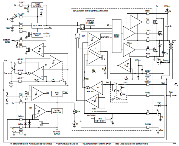 LTC®1438/LTC1439是双同步降压开关调节器控制器,用于驱动外部锁相式N沟道功率mosfet频率架构。自适应PowerTM输出级在频率上选择性地驱动两个N沟道mosfet高达400kHz,同时降低开关损耗高效率,低输出电流。使用外部PNP的0.5A辅助线性调节器pass器件提供低噪声、低电压差来源。二次绕组反馈控制引脚(SFB1)保证调节不受主负载的影响通过强制连续操作输出。一个附加的比较器可作为低值使用电池探测器。包括上电复位定时器(POR)产生延迟65536/fCLK的信号(典型值300ms)输出在规定值的5%以内输出电压。内部电阻分压器提供引脚远程感应功能开启时的可选输出电压两个输出之一。操作电流电平可通过用户编程外部电流检测电阻器。宽输入电源范围允许在3.5V至30V(最大36V)范围内工作。