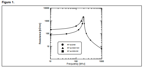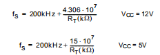 将RT连接到VCC=12V或VCC=5V时,频率降低(电流被强制进入引脚),根据与以下关系: