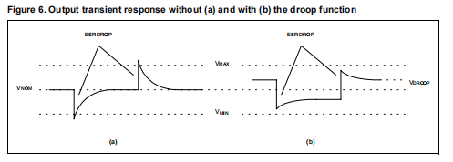 式中,VPROG是数模转换器的输出电压(即设定值),RL是电感抵抗。方程的第二项允许在零负载(∆V+)下产生正偏移;第三项引入下垂效应(∆VDROOP)。注意,如果出现以下情况,下垂效应等于ESR降: