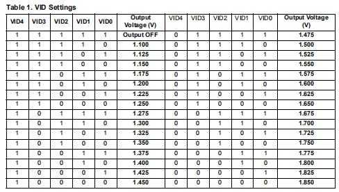 内置的数模转换器允许将输出电压从1.30V调整到2.05V50mV二进制步进,2.10V到3.50V,100mV二进制步进,如前表1所示。这个对内部基准进行了微调,以确保1%的精度。调节的内部参考电压由电压识别(VID)引脚编程。这些是内部DAC的TTL兼容输入,通过提供内部参考电压的一系列电阻实现。VID代码驱动多路复用器,该多路复用器在分隔线的点。DAC输出被传送到获得VPROG参考电压的放大器(即误差放大器的设定值)。提供内部上拉(通过5μa电流发生器实现);在这种情况下这样,编程逻辑“1”就足够让引脚浮动,而编程逻辑“0”就足够短了引脚接地。电压识别(VID)引脚配置还设置功率良好阈值(PGOOD)和过压保护(OVP)阈值。VID代码“11111”禁用该设备(作为SS引脚上的短路),并且不调节输出电压。