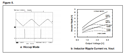 式中∆I为电感纹波电流,IOUTMAX为最大输出电流。在输出短路的情况下,软启动电容器以恒定电流(10μA典型值)放电,以及SS引脚达到0.5V软启动阶段重新启动。在软启动过程中,过流保护始终处于活动状态,如果发生此类事件,设备将关闭两个MOSFET,SS电容器将再次断电(在达到约4V的上限值之后)。系统现在在“打嗝”模式下工作,如图5a所示,在排除过流原因后,装置重新正常工作电源开关。