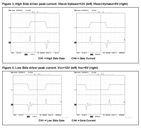 司机室高、低压侧驱动器的驱动能力允许使用不同类型的功率MOS(也可以是多个MOS降低RDSON),保持快速开关转换。低压侧mos驱动器由Vcc直接提供,而高压侧驱动器由启动引脚提供。采用自适应死区控制来防止交叉传导,并允许使用多种类型的mos fet。当下栅极大于200mV时,避免了上mos导通,而下mos导通为如果相位引脚超过500毫伏,则应避免。在任何情况下,上部mos在低压侧关闭。在5V和12V时,上(图3)和下(图4)驱动器的峰值电流都是4nF电容性的这些测量中使用了荷载。对于较低的驱动器,源峰值电流为1.1A@Vcc=12V和500mA@Vcc=5V,而sink峰值则为电流为1.3A@Vcc=12V,500mA@Vcc=5V。同样,对于上层驱动器,源极峰值电流为1.3A@Vboot Vphase=12V和600mA@VbootVphase=5V,而陷波峰值电流为1.3A@Vboot Vphase=12V和550mA@Vboot Vphase=5V。