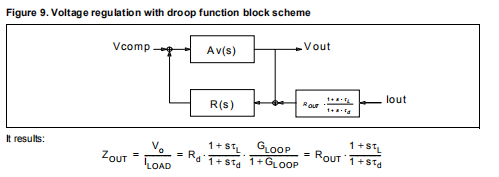如图6所示,ESR降在任何情况下都存在,但使用降速函数,则输出电压最小。实际上,降速功能引入了与输出电流成比例的静态误差(图6中的Vdroop)。由于不存在感应电阻,因此使用电感的固有电阻(几个mΩ)。因此,在反馈信号中加入低通滤波电感电压(即电感电流),以简单的方式实现下垂功能。指的是如图7所示,闭环系统的静态特性为: