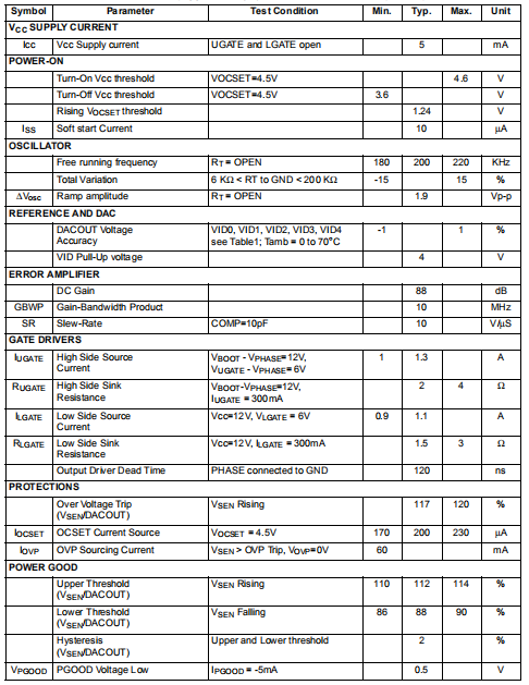 该器件是采用BCD技术实现的集成电路。它提供完整的控制逻辑和保护为高性能降压DC-DC转换器优化微处理器电源。它是设计的在同步整流buck拓扑中驱动N沟道mosfet。该装置工作正常,Vcc范围从5V到12V,并从1.26V功率级电源电压(Vin)开始调节输出电压。这个转换器的输出电压可精确调节,可编程VID引脚,从1.100V到1.850V采用25mV二进制步进,温度和线电压变化的最大公差为±1%。这个该装置提供快速瞬态响应的电压模式控制。它包括一个200kHz的自激振荡器从50kHz到1MHz可调。误差放大器具有15MHz的增益带宽乘积和10V/μs的转换率,允许高转换带宽以实现快速瞬态性能。产生的PWM占空比范围为0%到100%。设备防止过电流情况进入卡滞模式。设备通过使用上部MOSFET的rDS(ON)消除了对电流敏感电阻的需要。该设备提供SO20包装