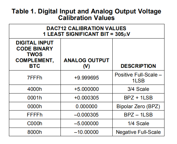 DAC712被设计成接受与双极性模拟输出操作兼容的正真二进制二进制补码(BTC)输入代码。对于双极模拟输出配置,7FFFh的数字输入提供正满标度输出,8000h给出负满标度输出,0000h给出双极零输出。
